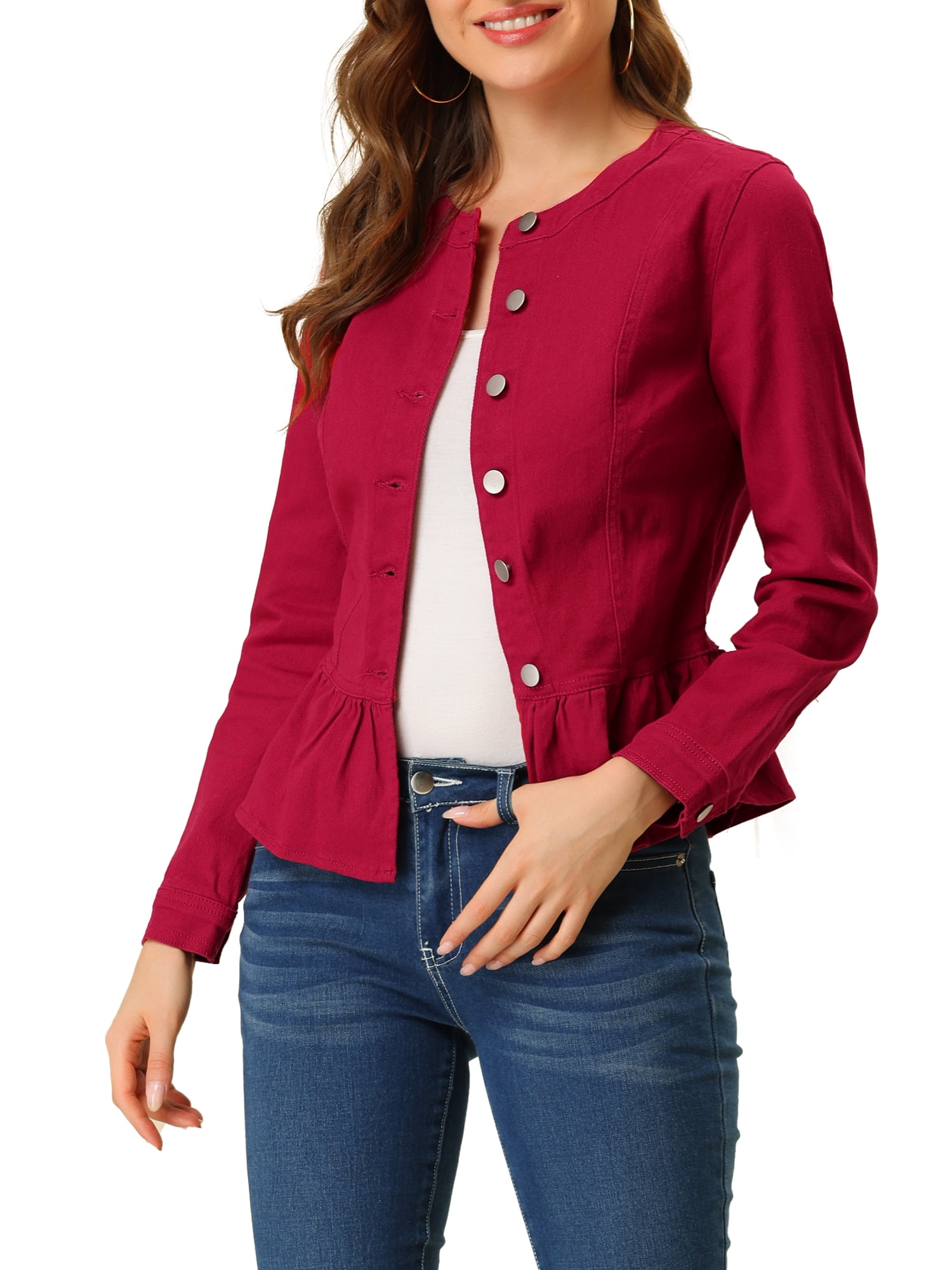 Allegra K Women S Round Neck Button Down Ruffled Hem Cropped Washed Denim Jacket Walmart Com